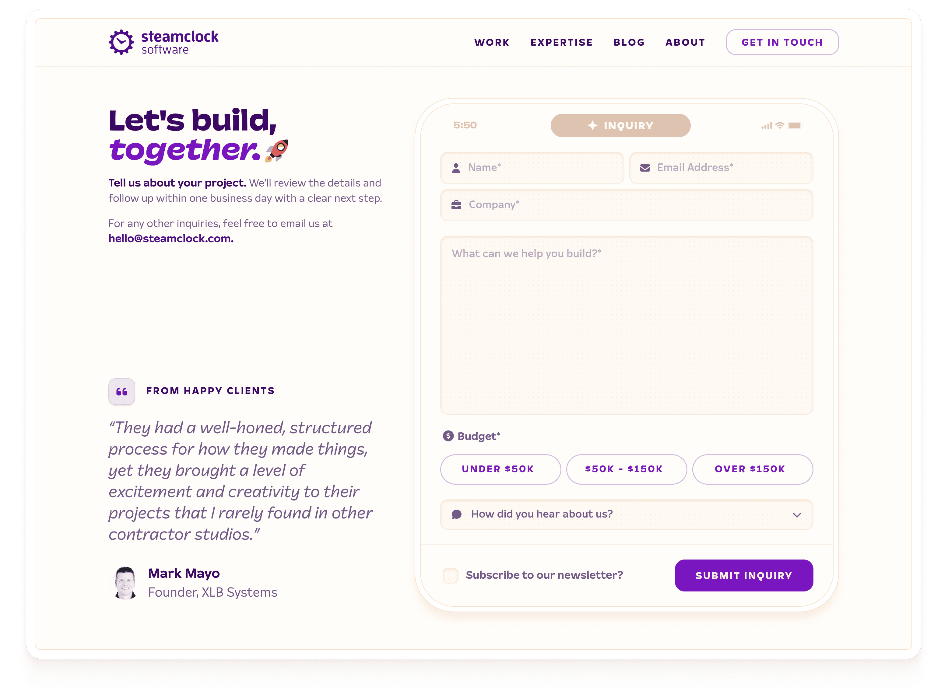 - It wouldn’t be a Steamclock website without at least some delightful details ✨ sprinkled in, like the app dock footer and phone-shaped contact form. Poke around and you’ll spot a few Easter eggs alluding to our love of mobile.