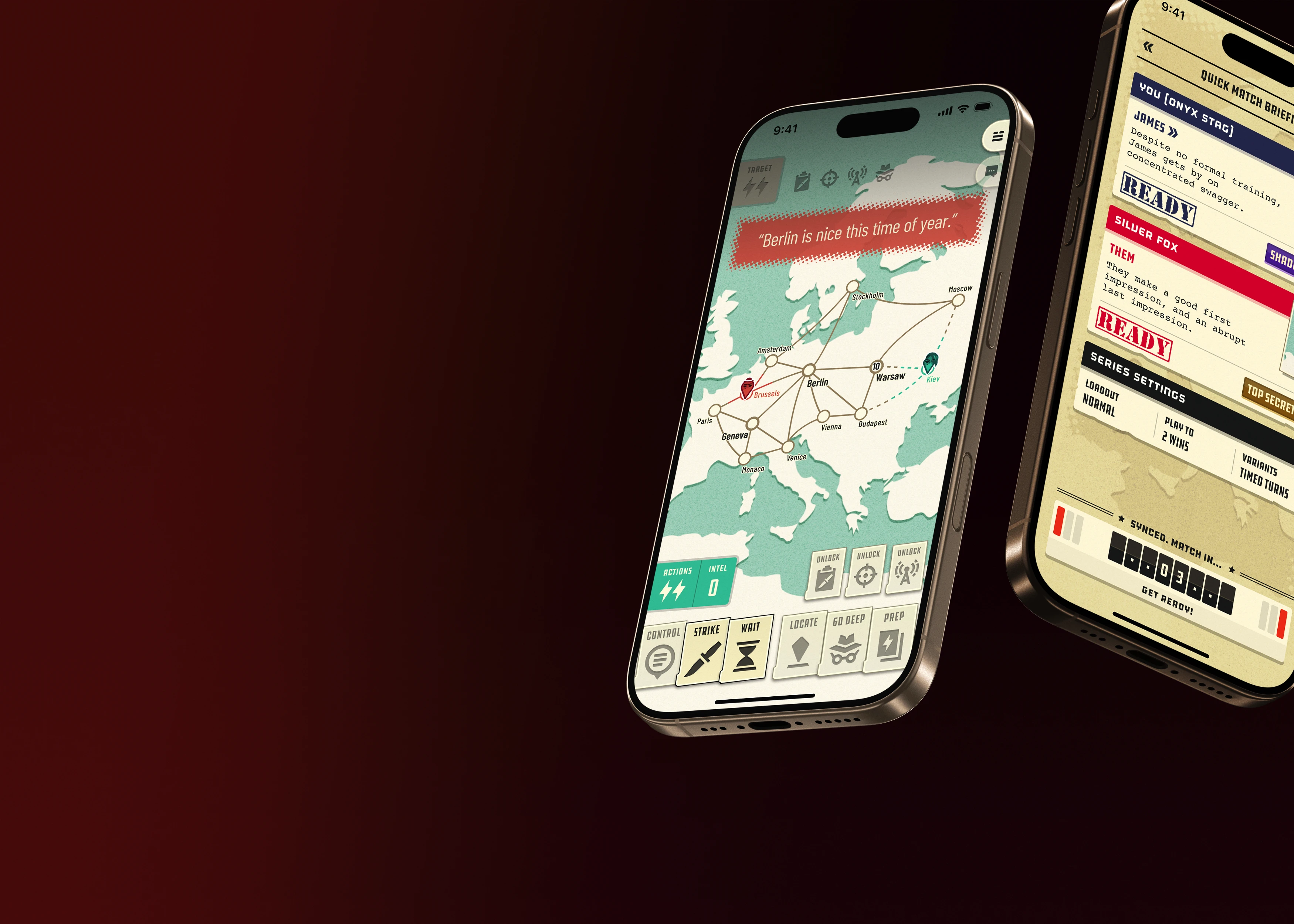 Two Spies is a turn-based spy strategy game for iPhone and iPad. Players find themselves in cold war Europe, using simple game mechanics and surprisingly deep gameplay to control the map, outwit one another, and take out enemy agents. The game has no pay-to-win mechanics or consumables, just a storefront for cosmetic upgrades and a non-renewing Season Pass for players who want to earn online ranks and view their gameplay stats.