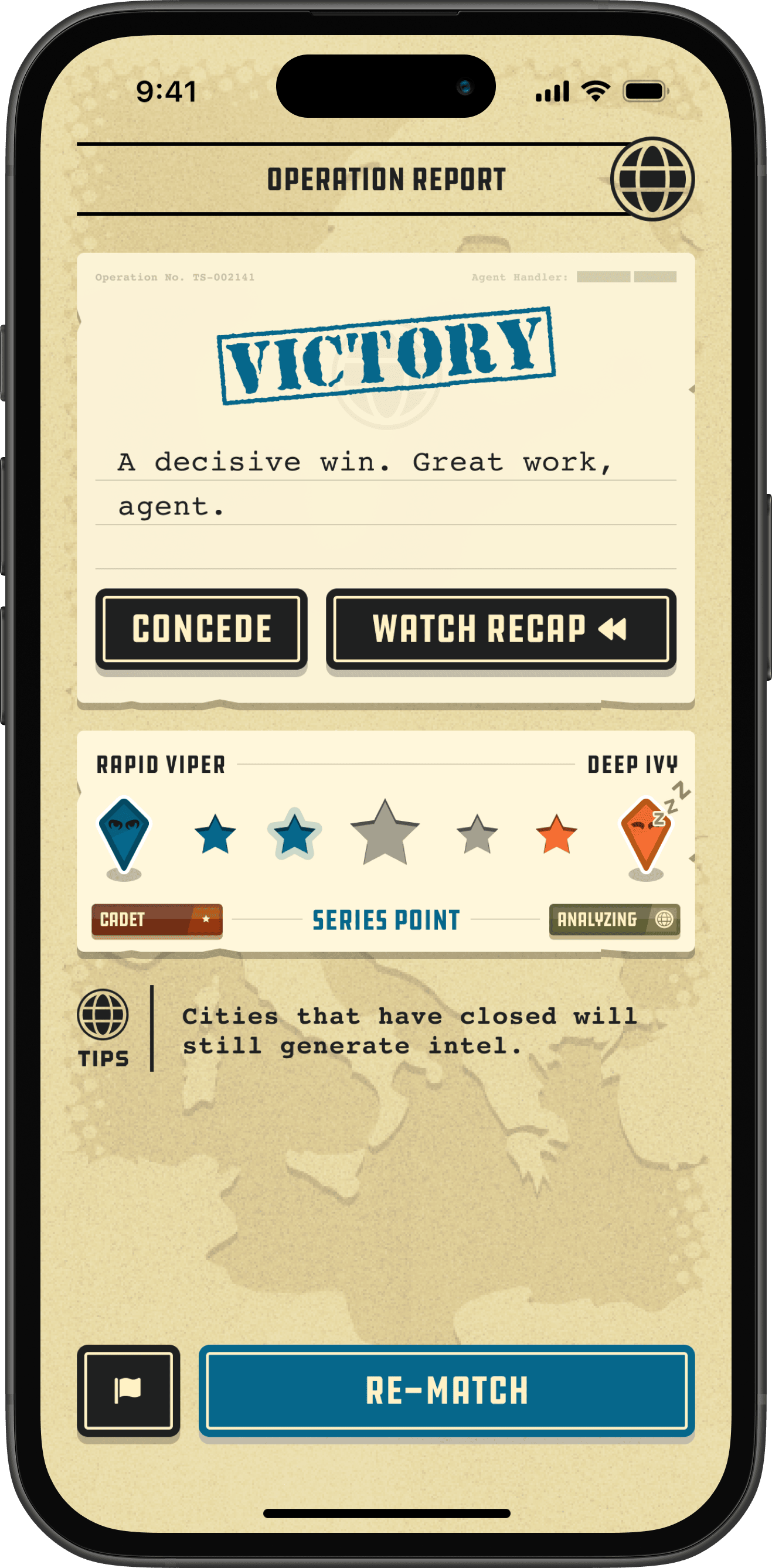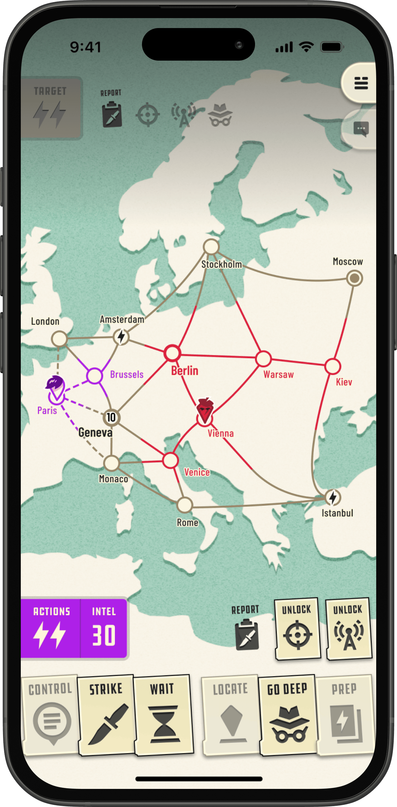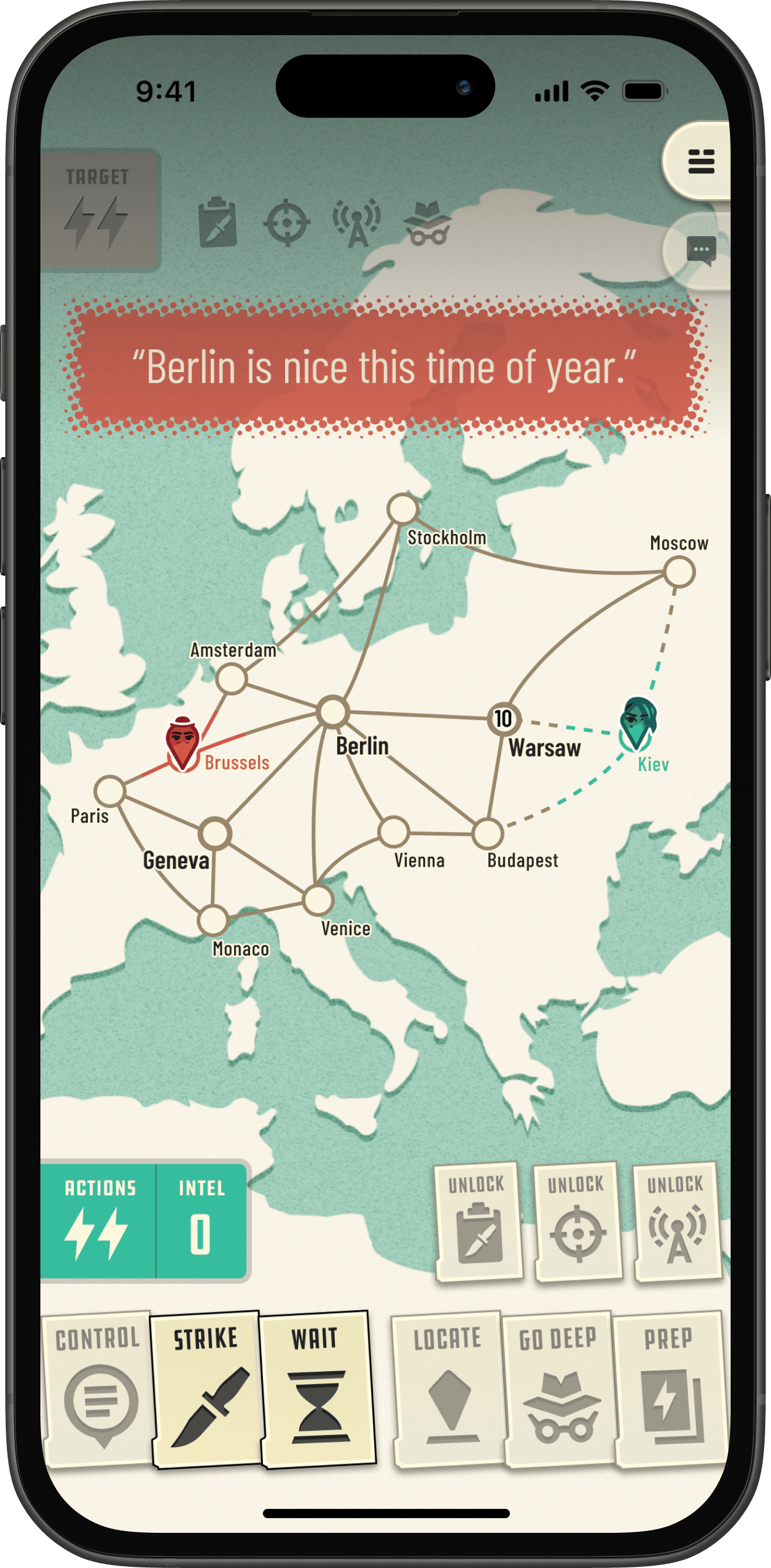 Two Spies is a turn-based spy strategy game for iPhone and iPad. Players find themselves in cold war Europe, using simple game mechanics and surprisingly deep gameplay to control the map, outwit one another, and take out enemy agents. The game has no pay-to-win mechanics or consumables, just a storefront for cosmetic upgrades and a non-renewing Season Pass for players who want to earn online ranks and view their gameplay stats.