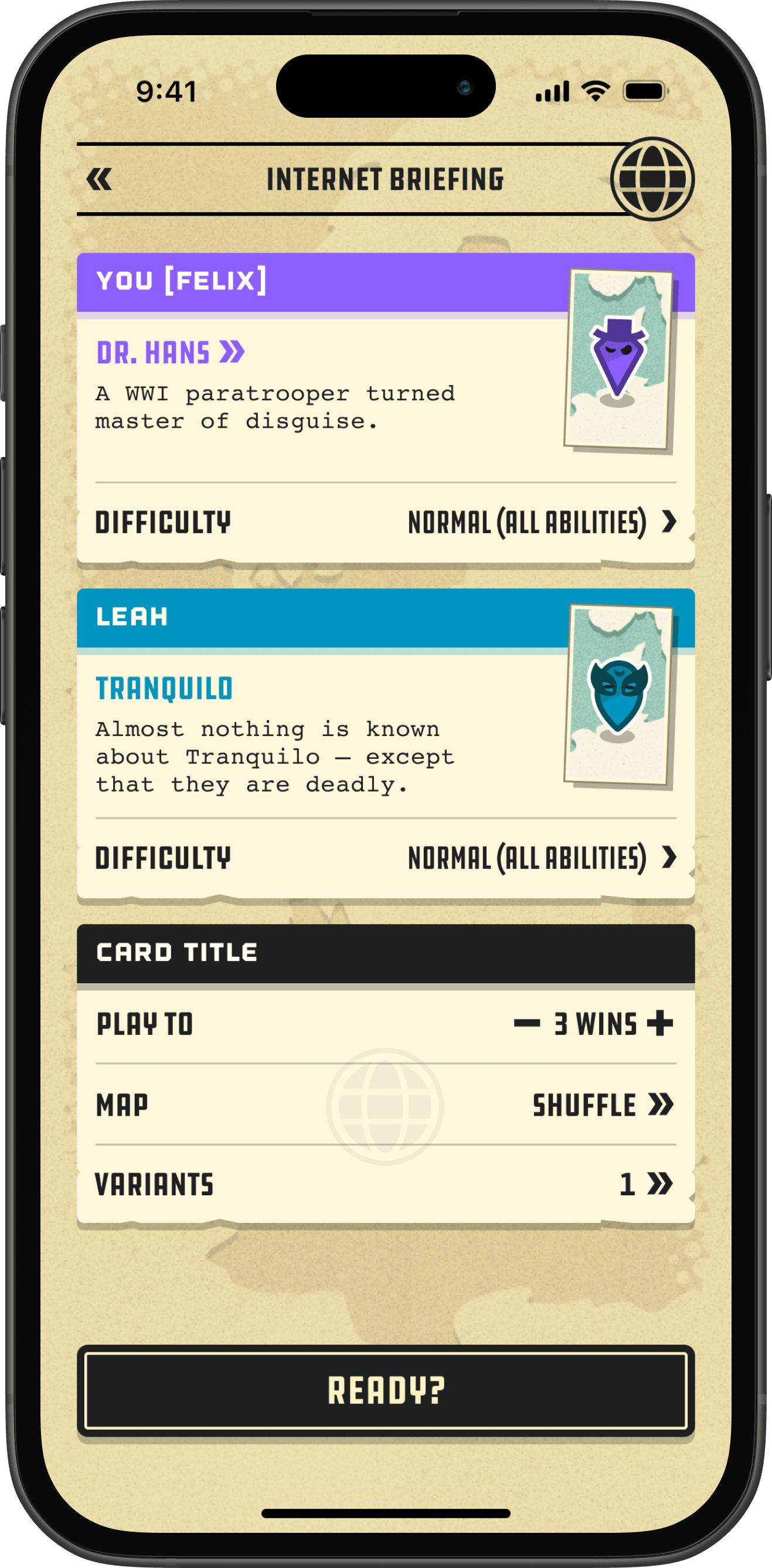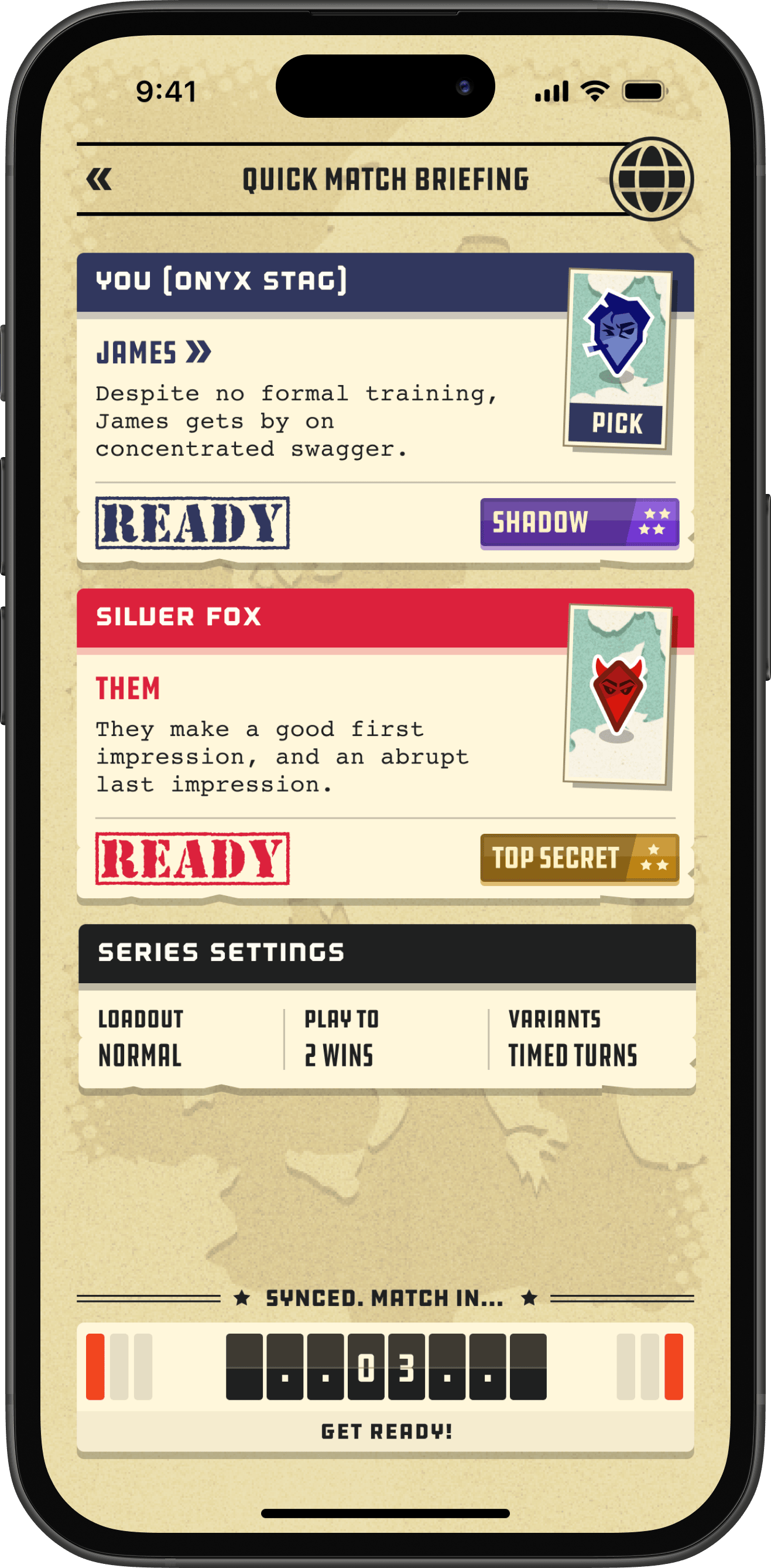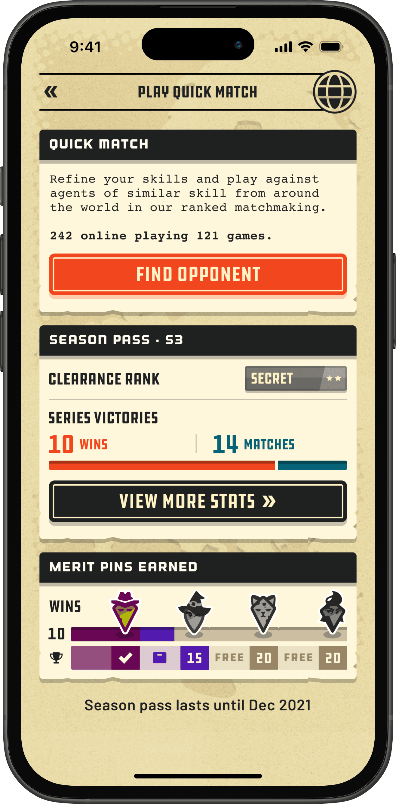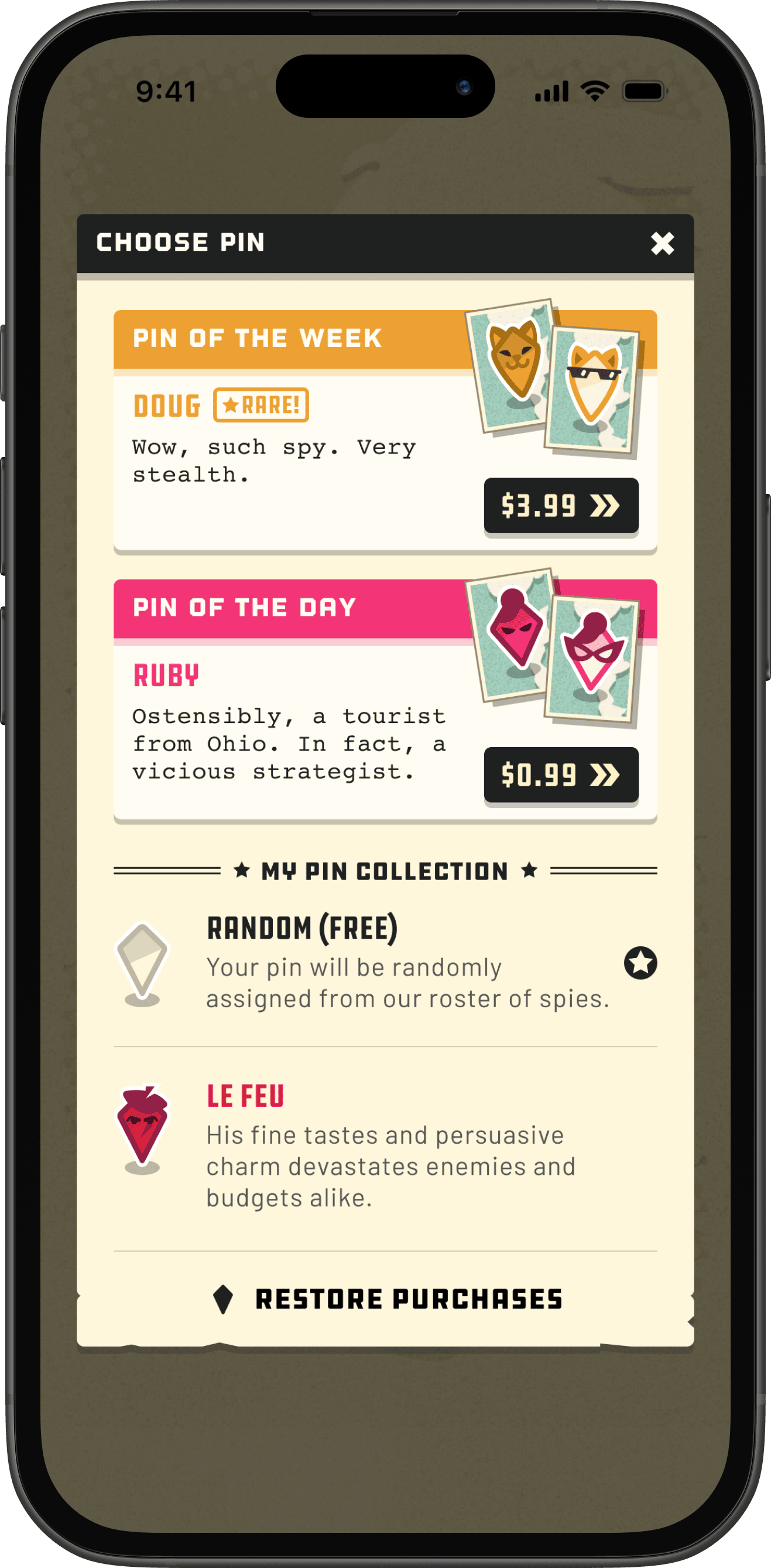 Two Spies is a turn-based spy strategy game for iPhone and iPad. Players find themselves in cold war Europe, using simple game mechanics and surprisingly deep gameplay to control the map, outwit one another, and take out enemy agents. The game has no pay-to-win mechanics or consumables, just a storefront for cosmetic upgrades and a non-renewing Season Pass for players who want to earn online ranks and view their gameplay stats.